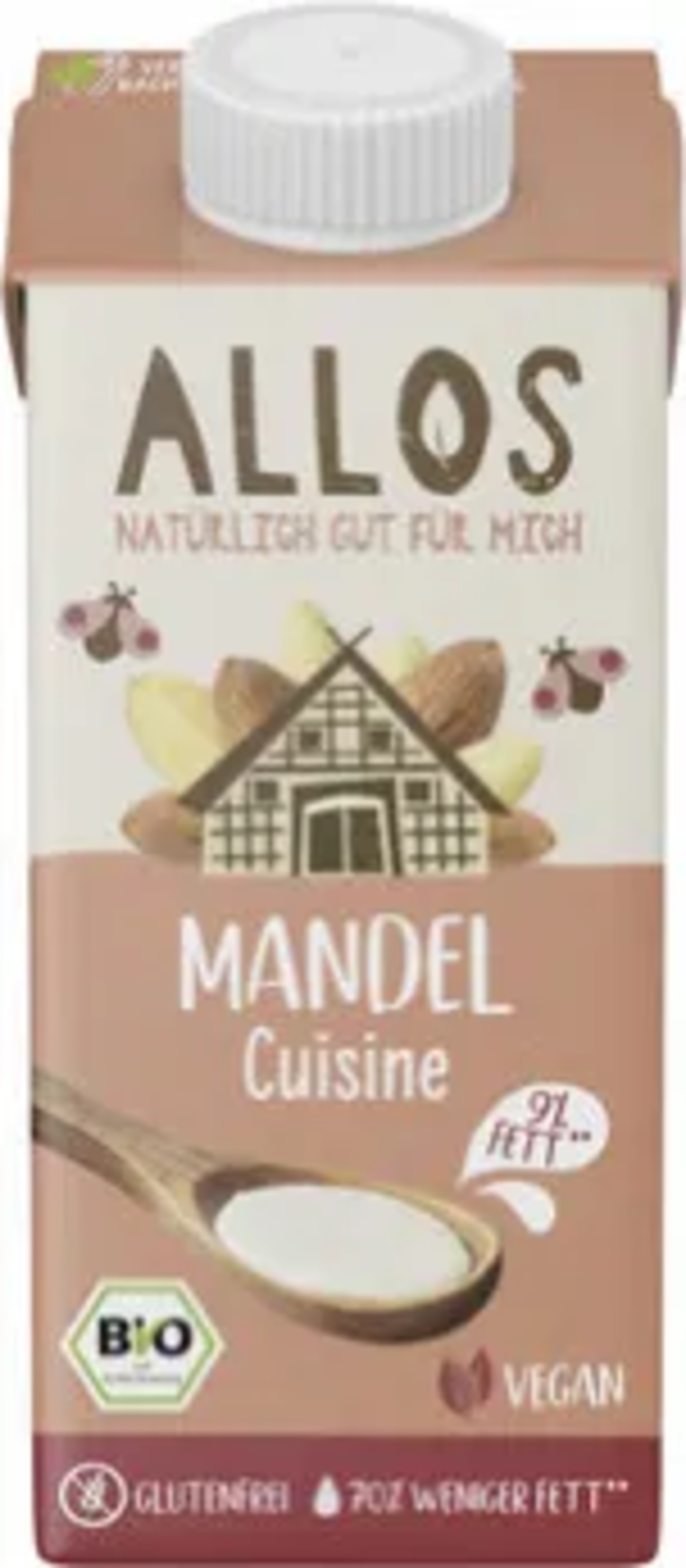 Fine Almond Cuisine by Allos - ideal for plant-based sauces, soups, casseroles and more. It has a smooth creamy texture like real cream but is purely plant-based. With 21% fat.