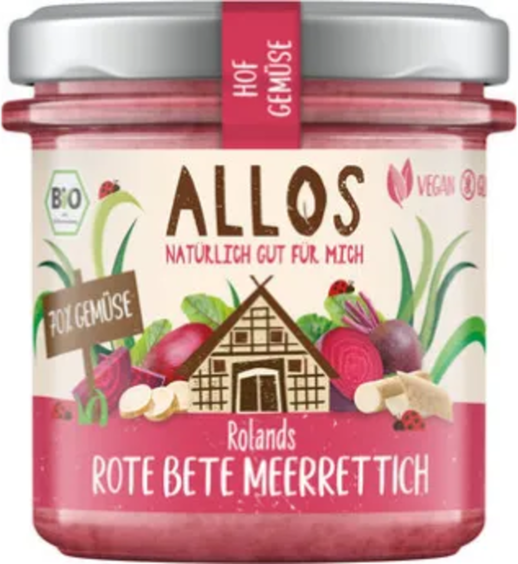 50 % Beetroot[1], 12 % Horseradish[1], Sunflower oil[1], Sunflower seeds[1], 4 % Onions[1], 4 % Pickled cucumbers[1], Cucumbers[1], Spirit vinegar[1], Beet sugar[1], Sea salt, Agave nectar[1], Potato starch[1], Spirit vinegar[1], Lemon juice concentrate[1], Caraway seeds[1], Cloves[1], Thickening agent (Carob gum[1]), Herbal Extract[1]