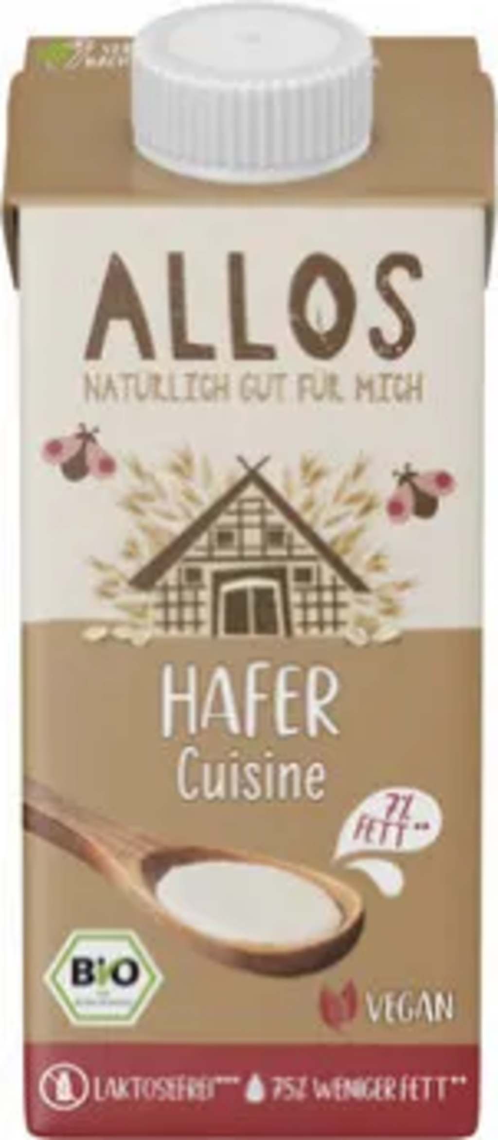 ALLOS Oat Cuisine - ideal for plant-based sauces, soups, casseroles and more. It has a smooth and creamy consistency just like dairy cream but is completely plant-based. Fat content: 7%
