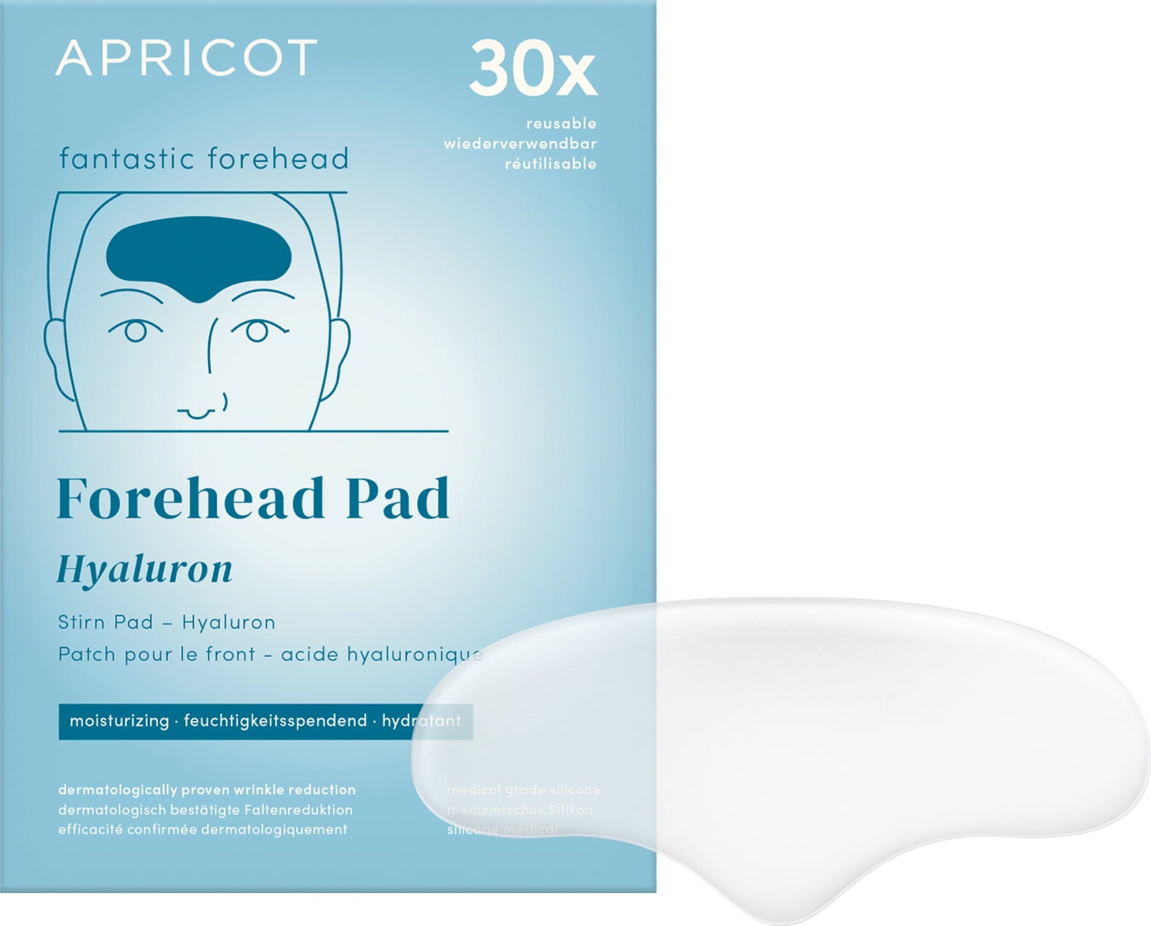 The Hyaluronic Acid Forehead Pad by APRICOT provides intensive and long-lasting care in the forehead area using low-molecular hyaluronic acid. The pad is made of medical-grade silicone and can be reused up to 30 times. It provides the skin with valuable moisture and helps to smooth fine lines and wrinkles.