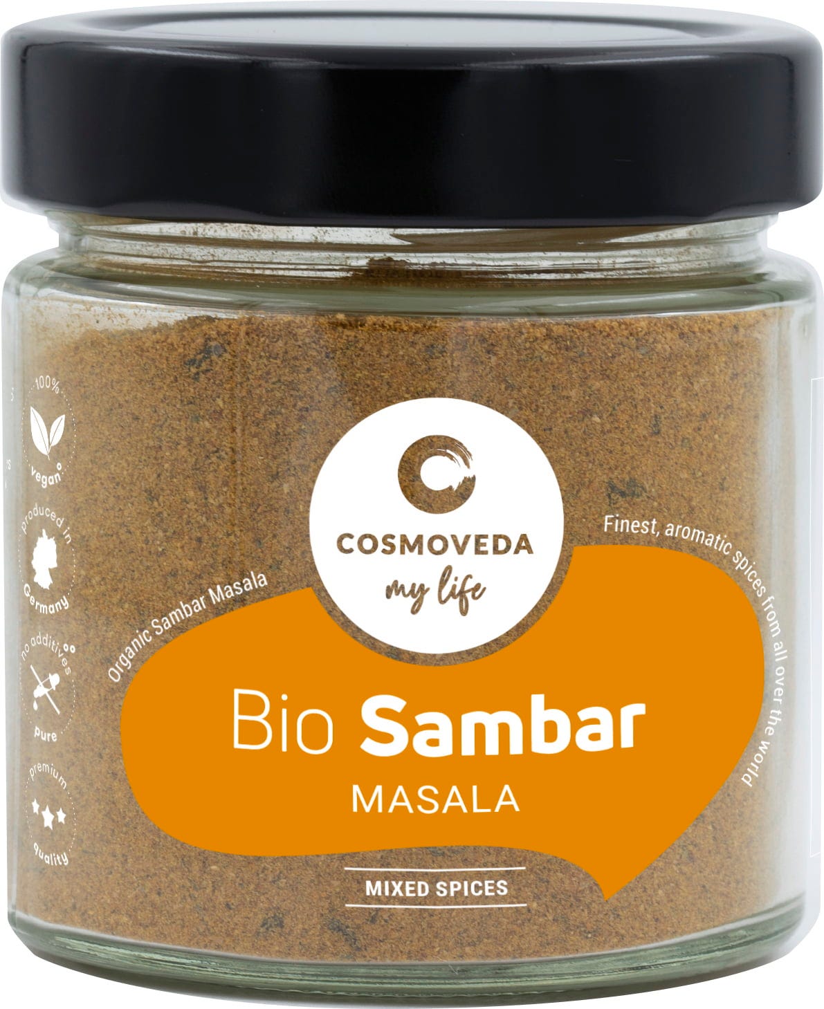 COSMOVEDA Organic Sambar Masala, a specially formulated Ayurvedic blend of fine spices for making delicious sambar.