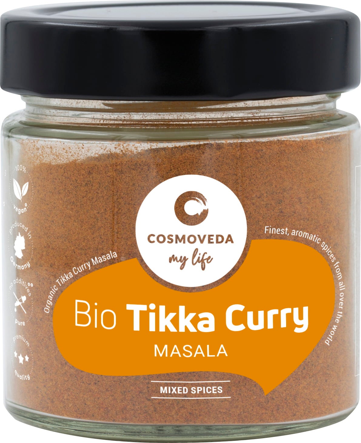 COSMOVEDA Organic Tikka Masala Curry, a specially formulated Ayurvedic blend of fine spices to conjure up delicious tikka curry.
