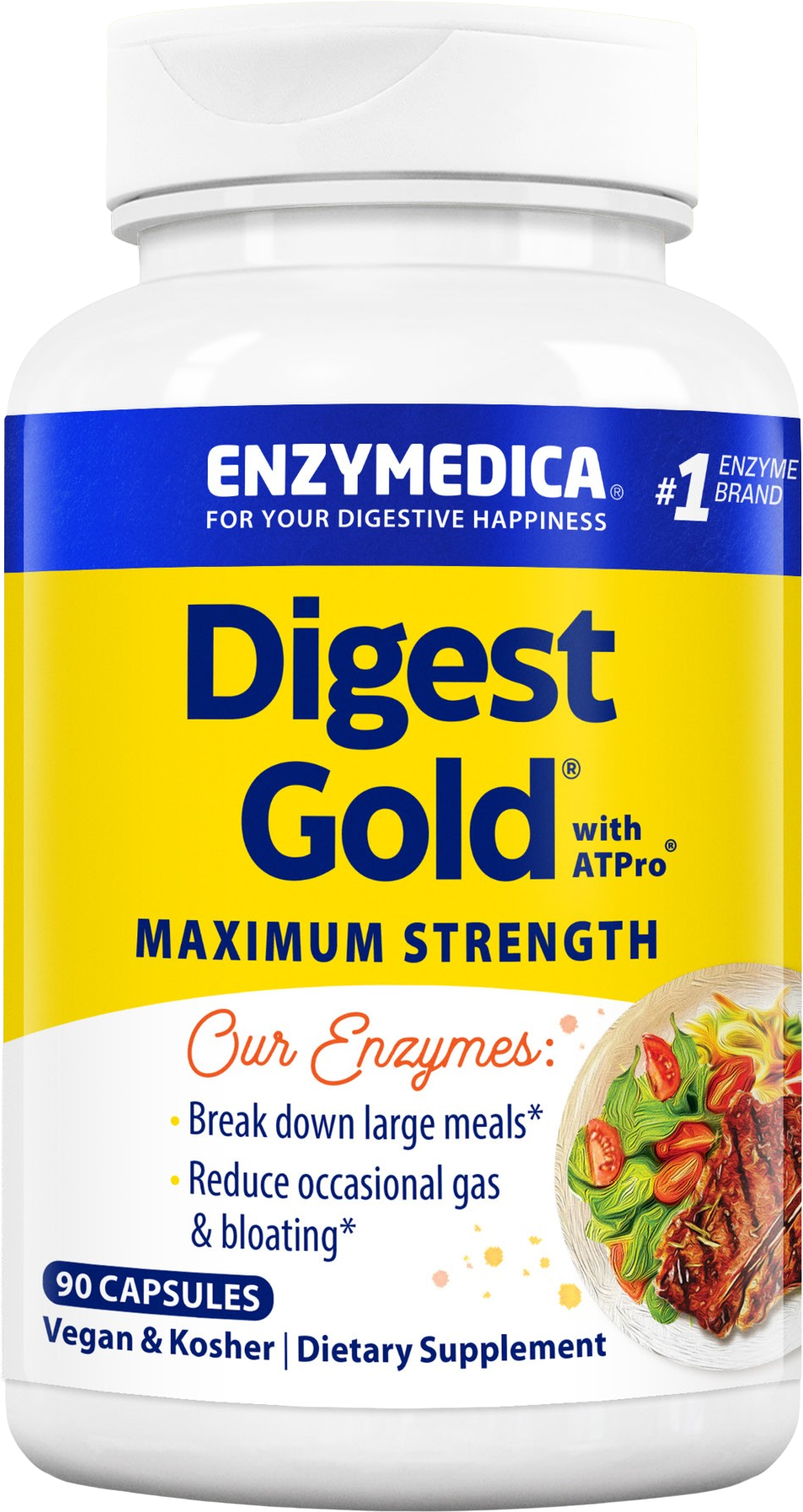 Digest Gold® with ATPro® contains a special blend of different enzymes that break down the main nutrients. Thera-blend® technology ensures that the enzymes remain active across the different pH ranges of the body. The formula also provides ATPro® and enzymes for fibre and lactose. The capsules are to be taken as a supplement to meals. Non-GMO and kosher.