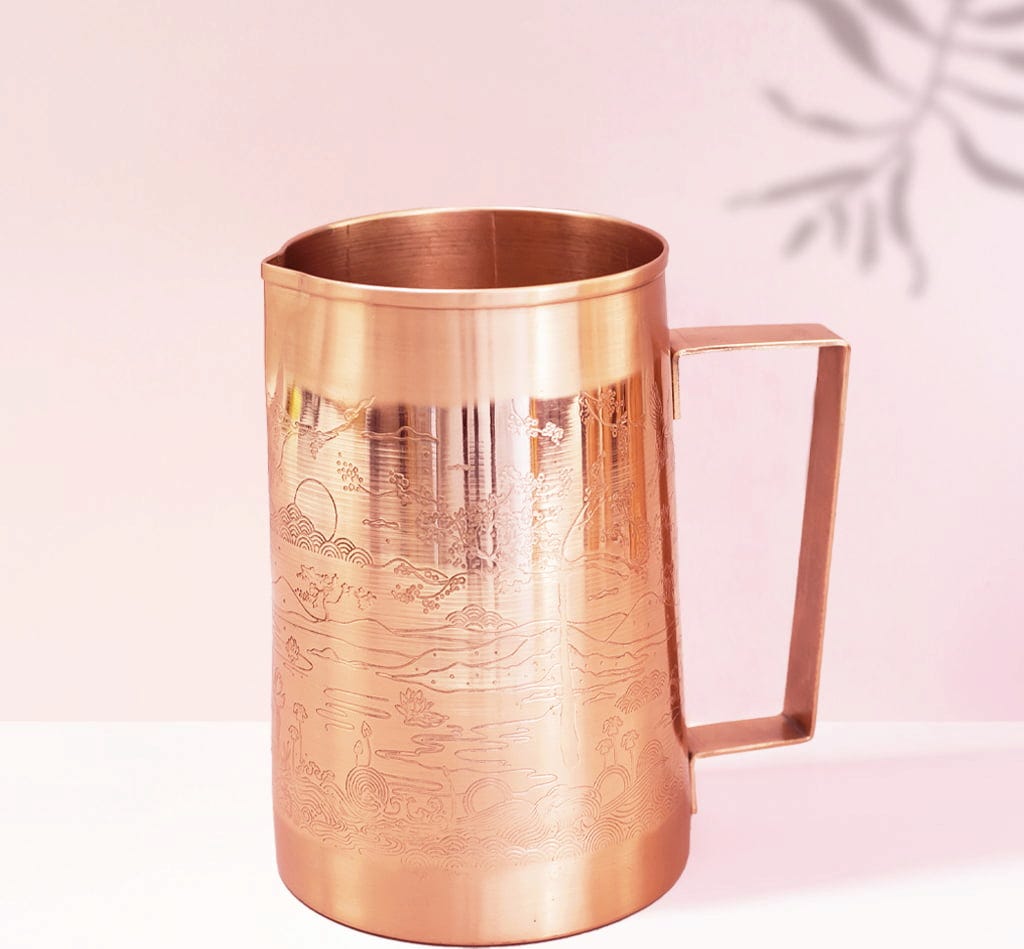 This copper jug is ideal for serving still water or can alternatively be converted into a stylish flower vase. The jug made of food-safe copper is lovingly handcrafted in India and thus combines modern design with traditional handcraft. Coated on the outside with a food-safe lacquer and left natural on the inside, the jug provides naturally alkaline water.