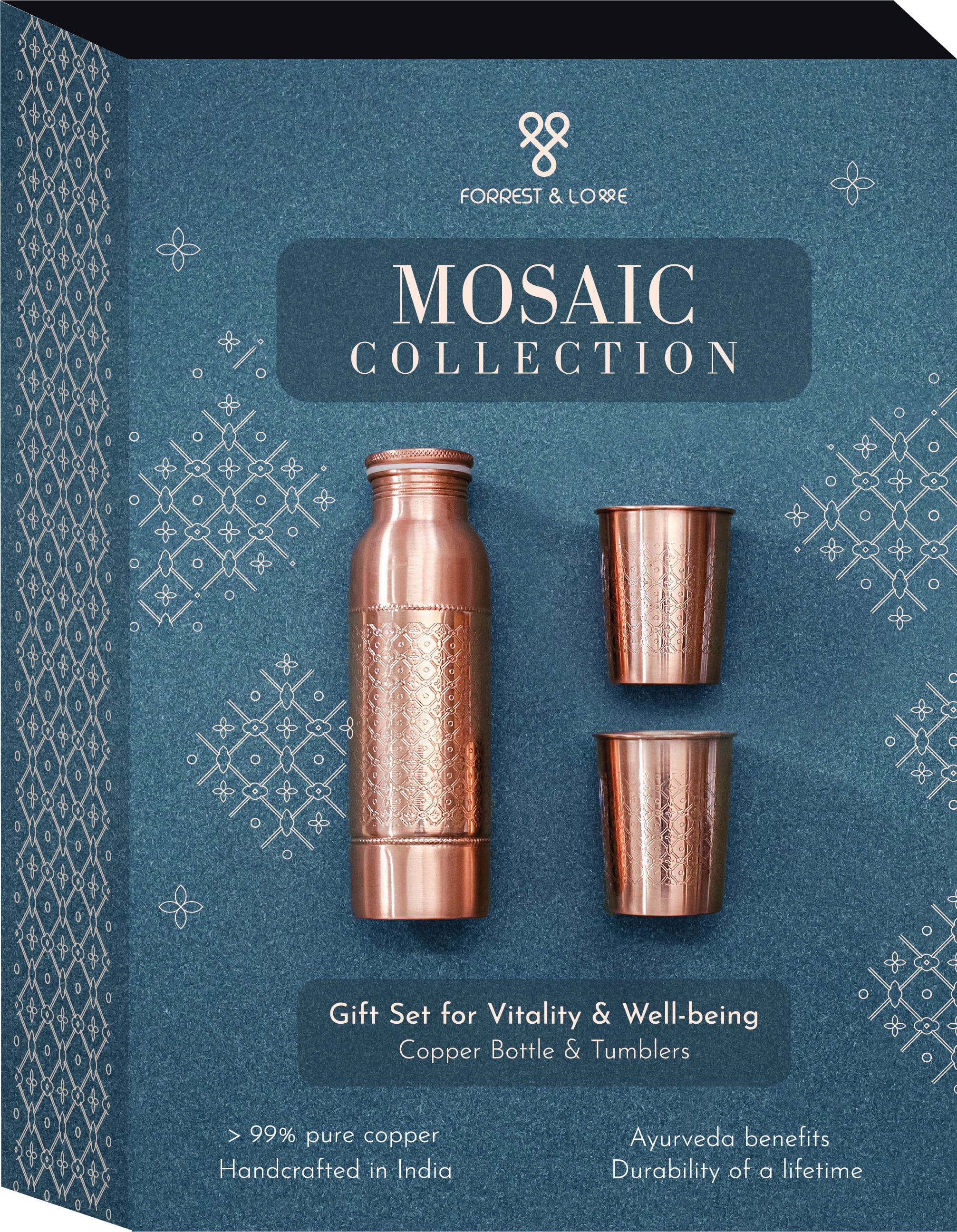 Inspired by palatial woodwork, this enchanting design impresses with its delicacy, highlighted by the copper finish. The bottle and the 2 cups are unique handmade pieces. The Copper Collection makes for a beautiful gift.