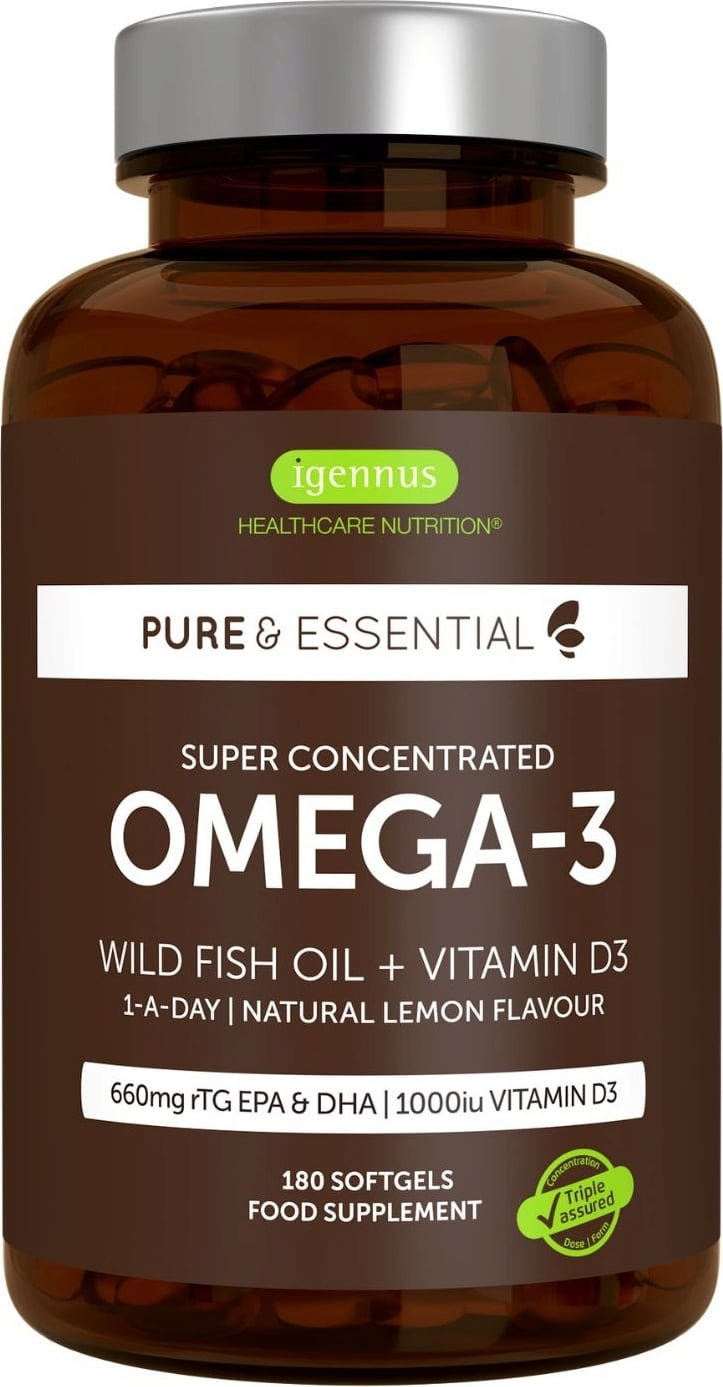 The Pure & Essential Super Concentrated Omega-3 softgels by Igennus combine high-quality fish oil in re-esterified triglyceride form (rTG) with vitamin D3 - ideal to meet daily requirements. Each capsule provides 660 mg of omega-3 fatty acids (EPA & DHA) and 1000 I.U. (25 µg) of vitamin D3 - in just one softgel a day. The product contains fish oil from sustainable wild-caught fish. The softgels are small, easy to swallow and have a pleasant natural lemon flavour.