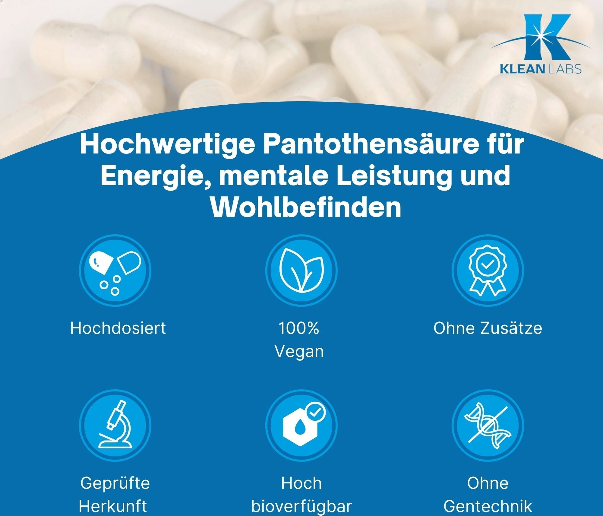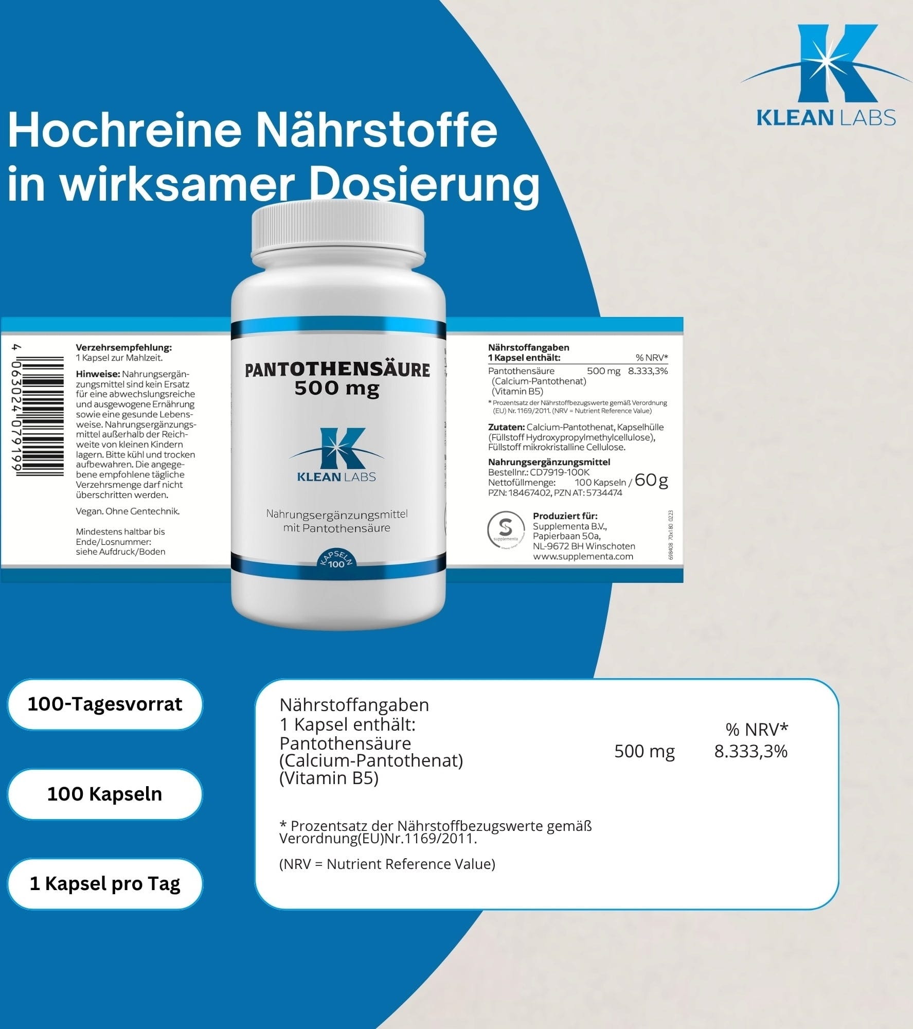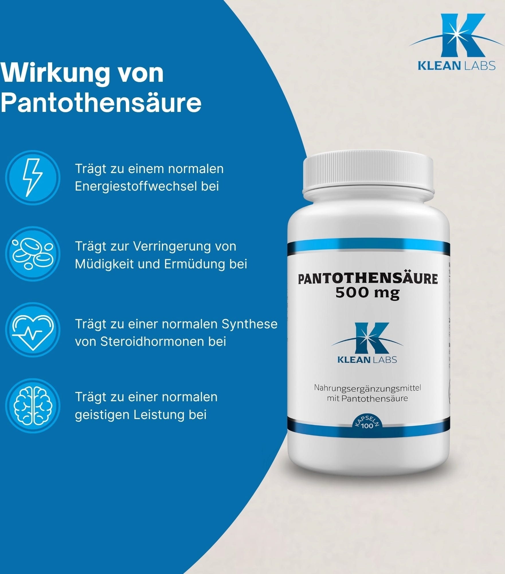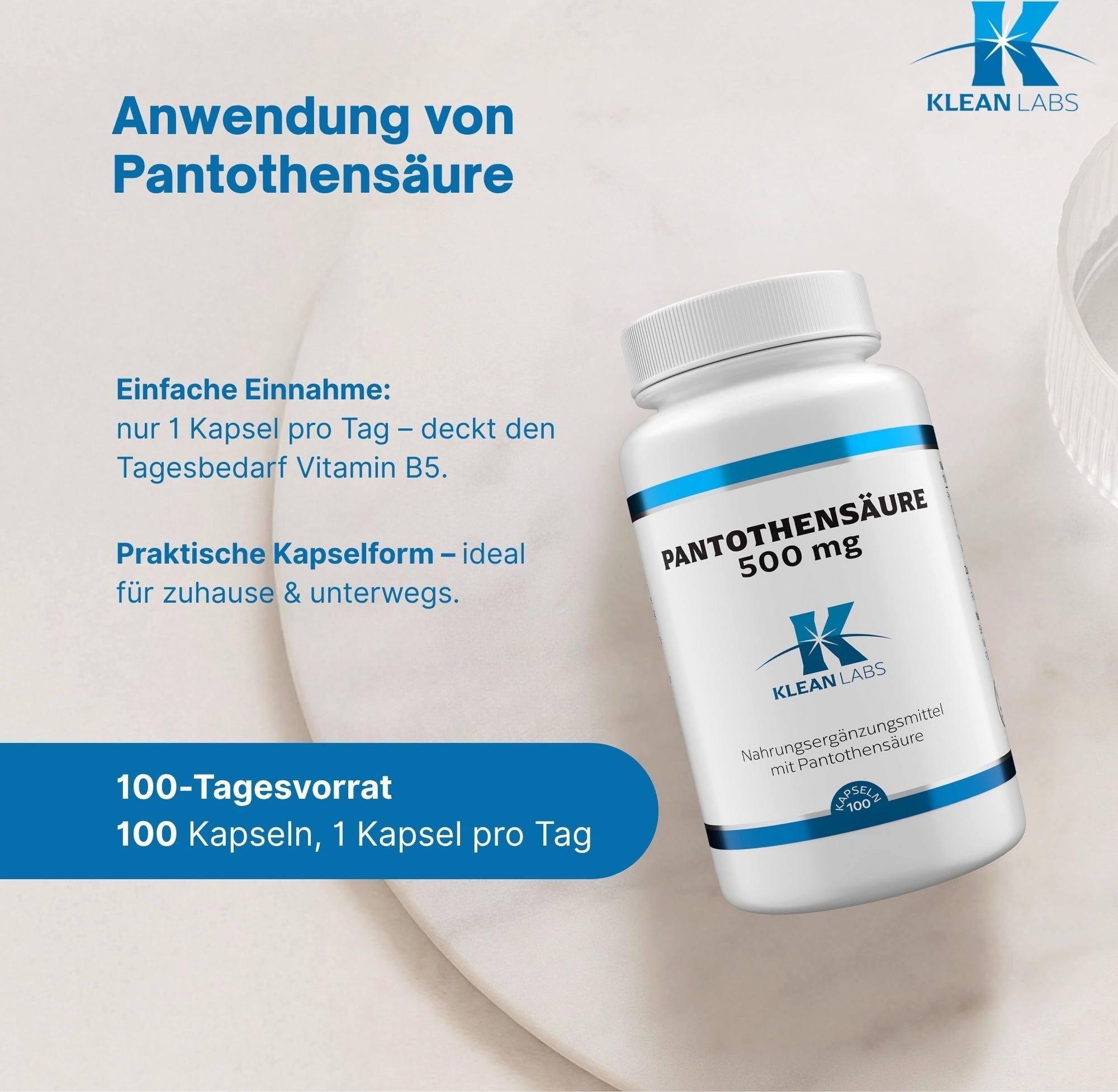 KLEAN LABS Pantothenic Acid (B5) 500 mg, 100 capsules