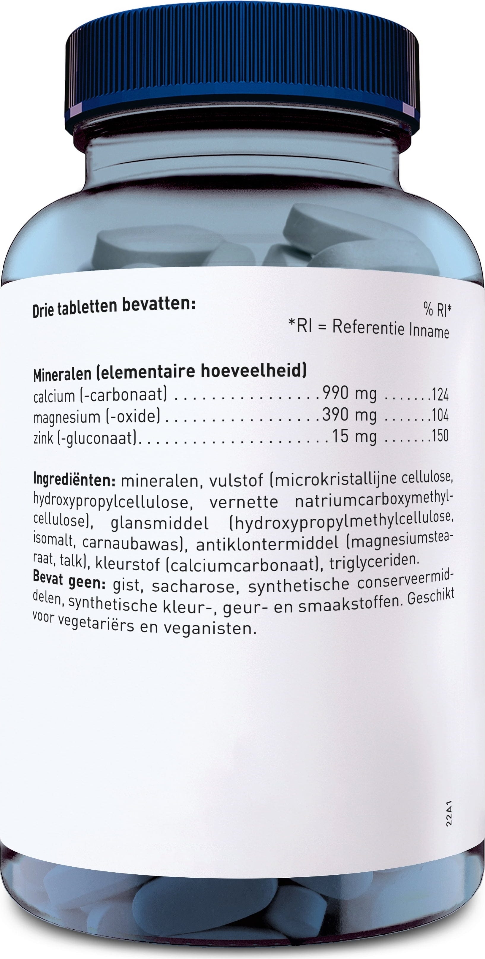 Calciumcarbonat, Magnesium (as Oxide), Filler (Microcrystalline cellulose, Hydroxypropyl cellulose, Sodium carboxymethyl cellulose), Zinc gluconate, Coating (Hydroxypropyl methylcellulose, Isomalt, Carnauba Wax), Release Agent (Magnesium salts of fatty acids, Talcum), Dye (Calciumcarbonat, Trigylcerides)