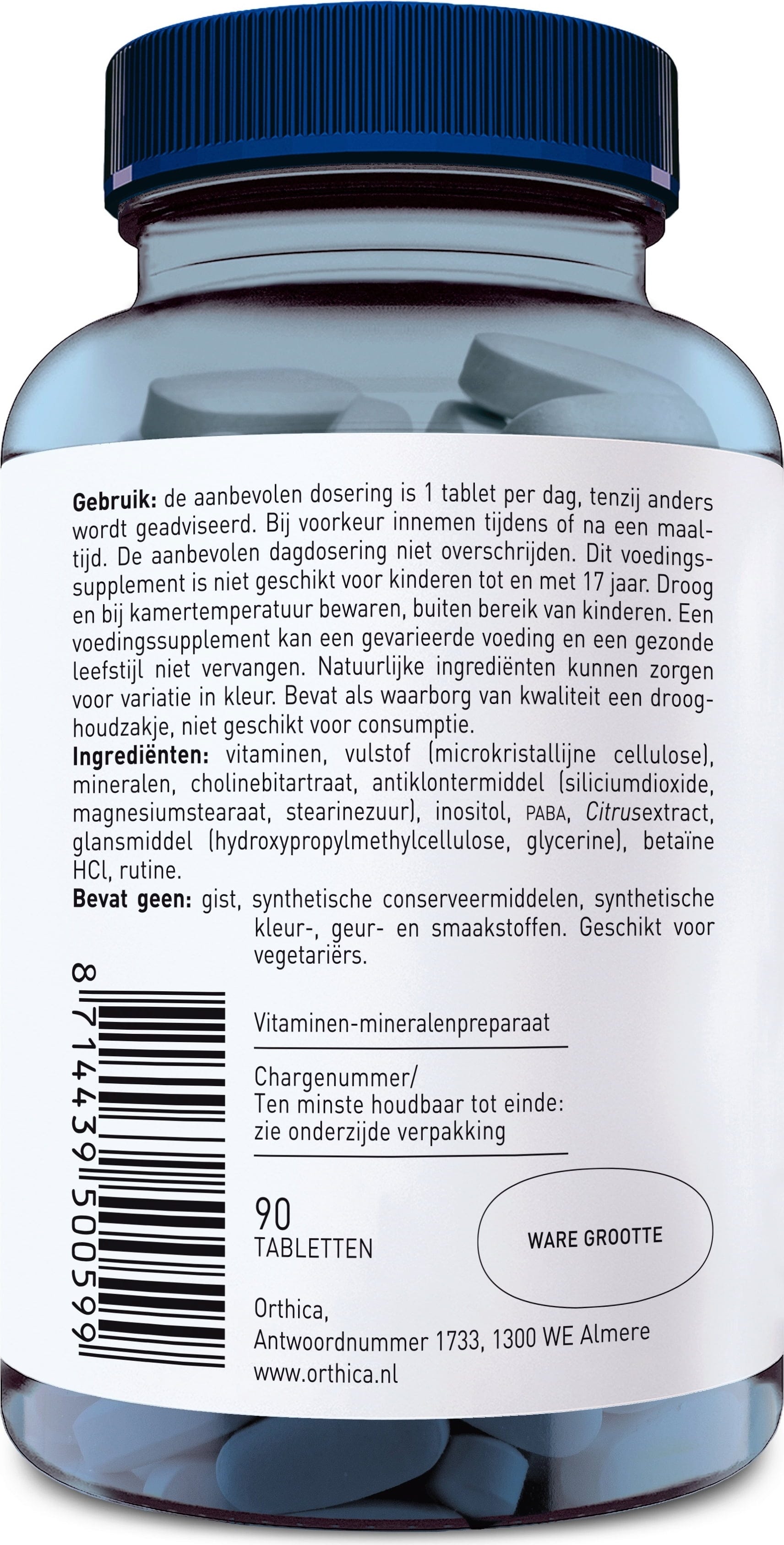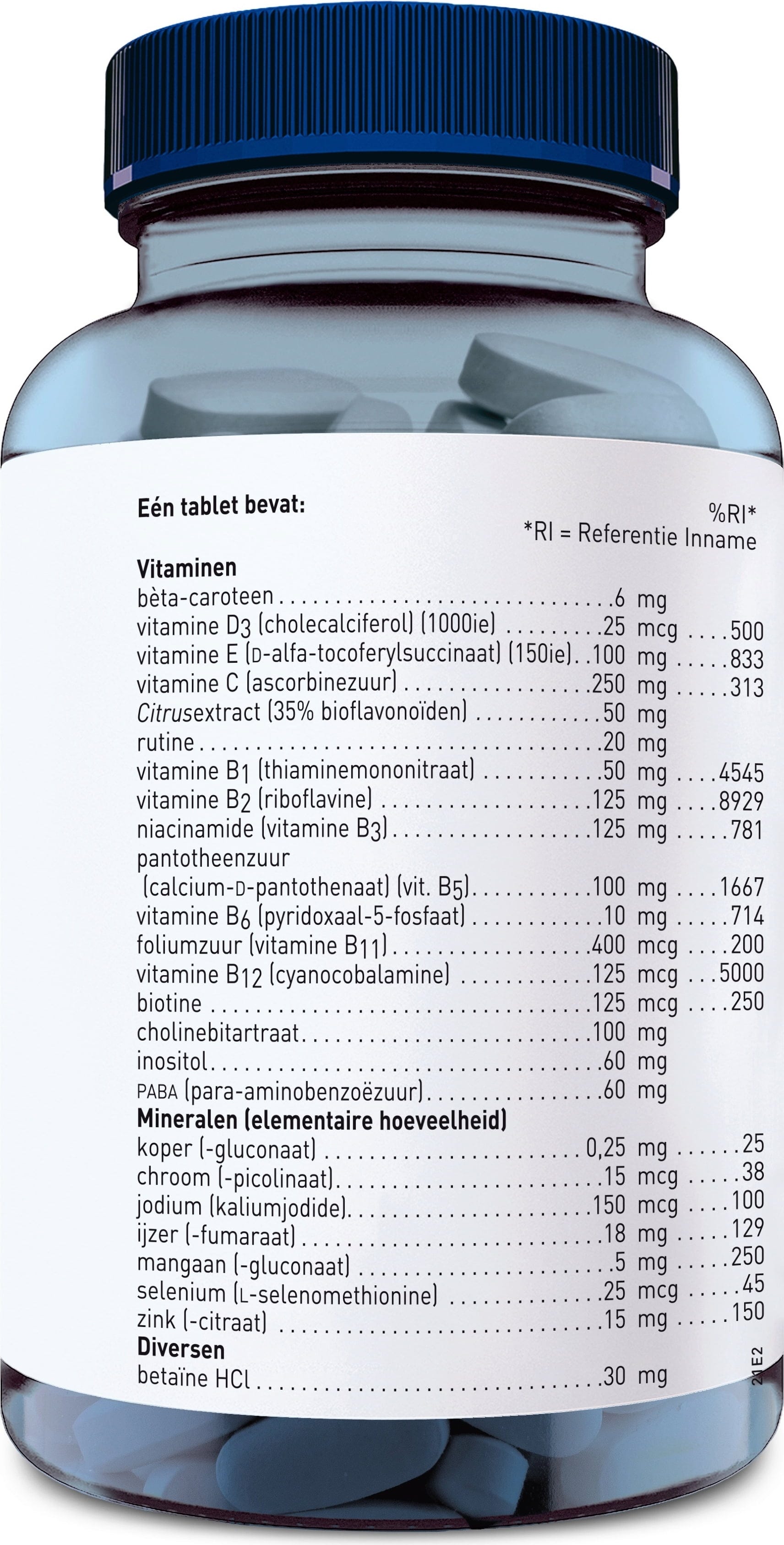 L-ascorbic acid, Riboflavin, Niacinamide, Filler (Microcrystalline cellulose), Vitamin E (D-Alpha tocopherol), Choline bitartrate, vitamin B5 (Calcium pantothenate), Release Agent (Silicon dioxide, Magnesium salts of fatty acids, Fatty acids), Inositol, PABA (para-aminobenzoic acid), Thiamine mononitrate, Citrus extract, Coating (Hydroxypropyl methylcellulose, Glycerine), Zinc citrate, Manganese gluconate, Betaine HCl, Rutin, Ferrous fumarate, Pyridoxal-5-phosphate, Beta-carotene, Copper gluconate, Folic acid, iodine (Fucus vesiculosus), Cyanocobalamin, Biotin, Selenomethionine, Vitamin D3 (cholecalciferol) (Cholecalciferol), Chromium picolinate