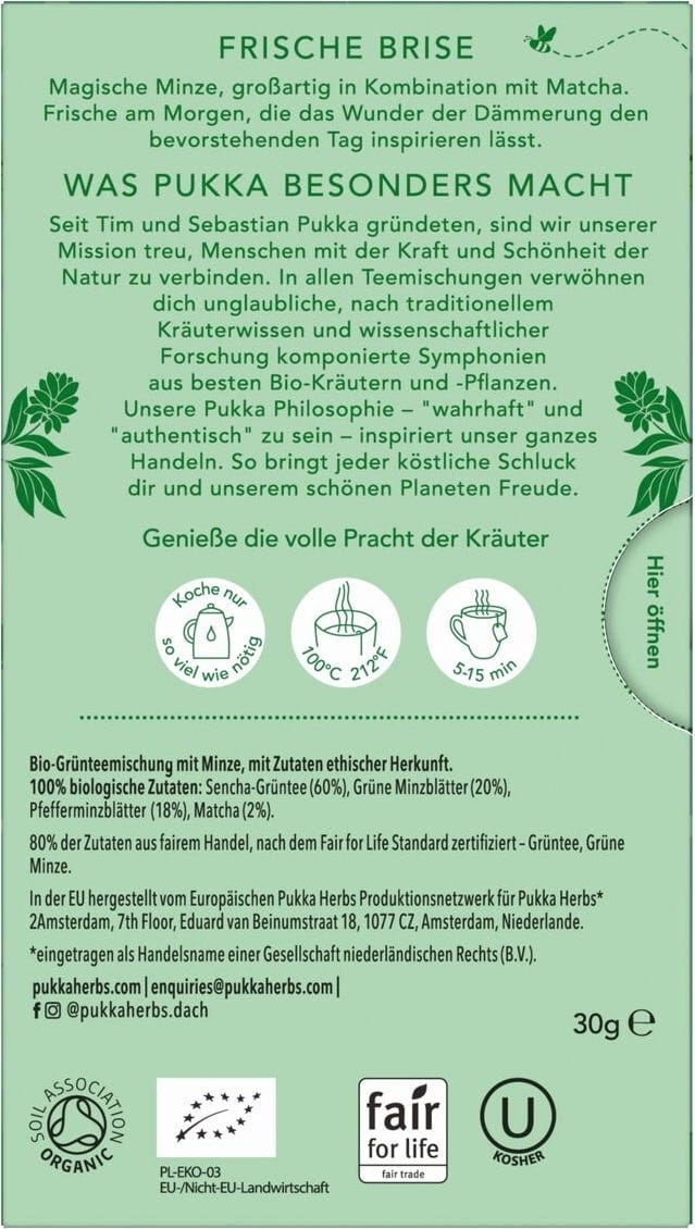 | Responsible food business operator: | Lipton Teas and Infusions Germany GmbH, Axel-Springer-Platz 3, c/o WeWork, 20355, Hamburg, Germany, kontakt@pukkaherbs.de |