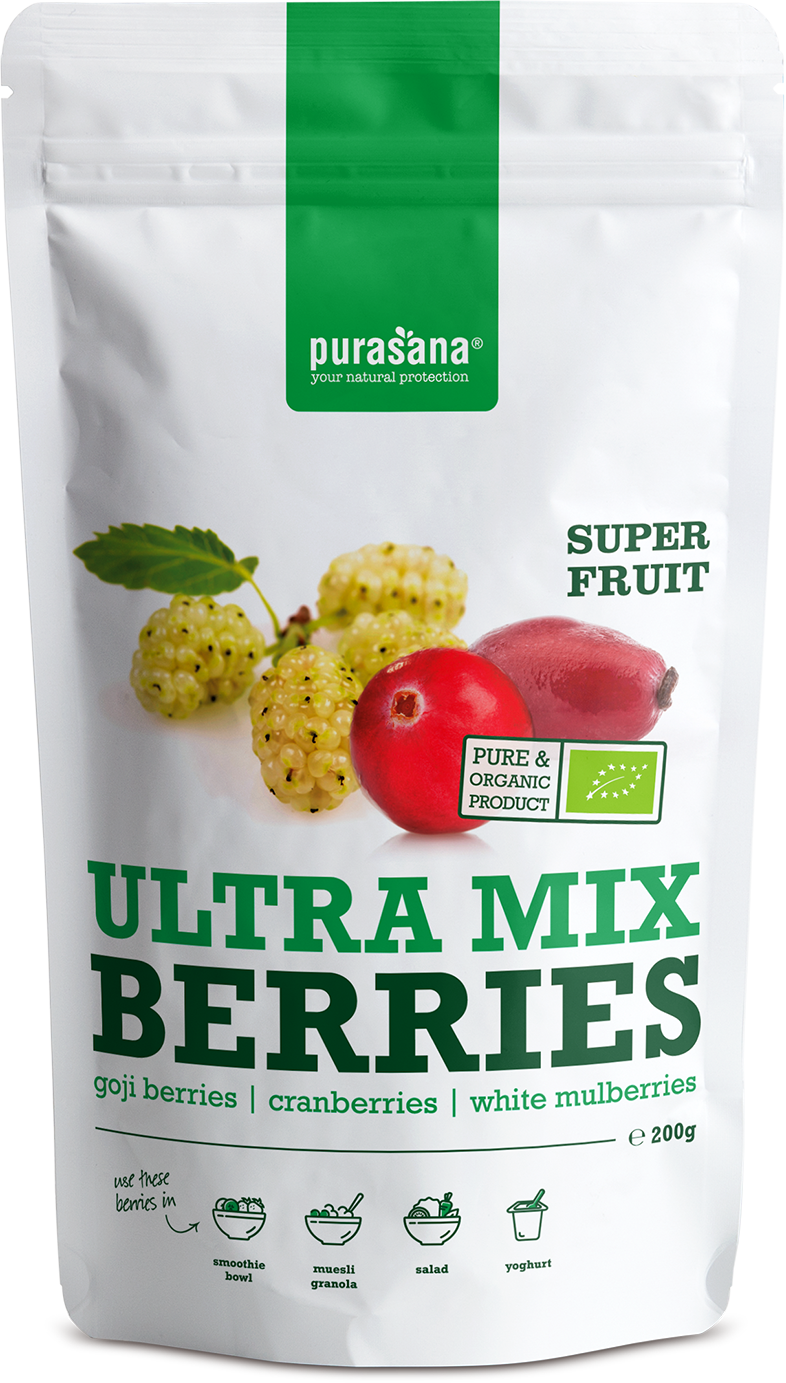 The Ultramix Organic Berry Mix by Purasana is a quality berry mix that consists of dried Goji berries (Lycium barbarum), dried and sweetened cranberries (Vaccinium macrocarpon) and dried white mulberries (Morus alba).