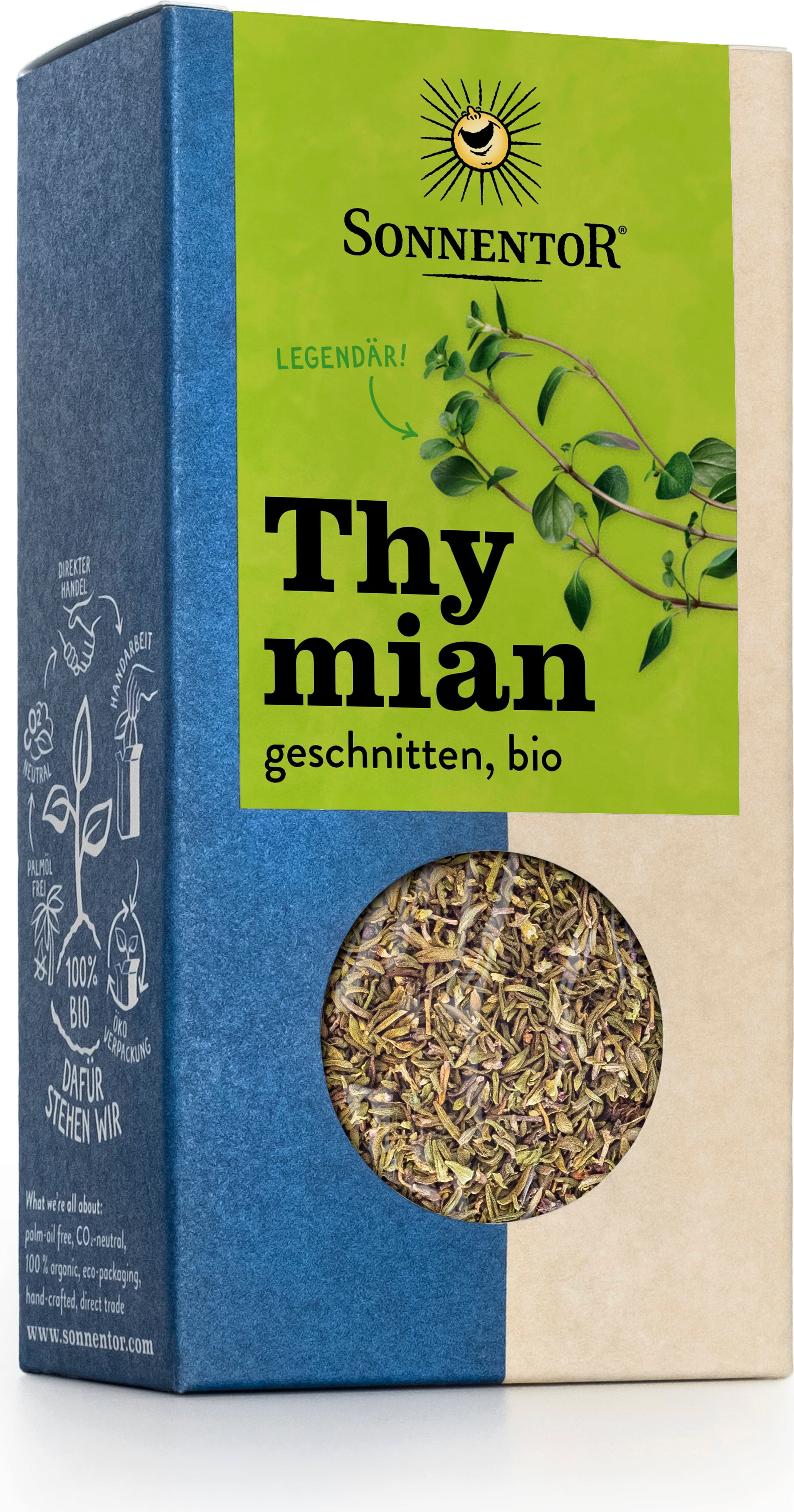 The earthy and peppery flavour has hints of anise, mint and camphor and provides Mediterranean dishes with their character. Thyme blends very well with onion, wine and beer. The intensely spicy, ethereal scent with a hint of pine needles is reminiscent of the Mediterranean. The hint of mint rounds off the fresh flavour of thyme.
