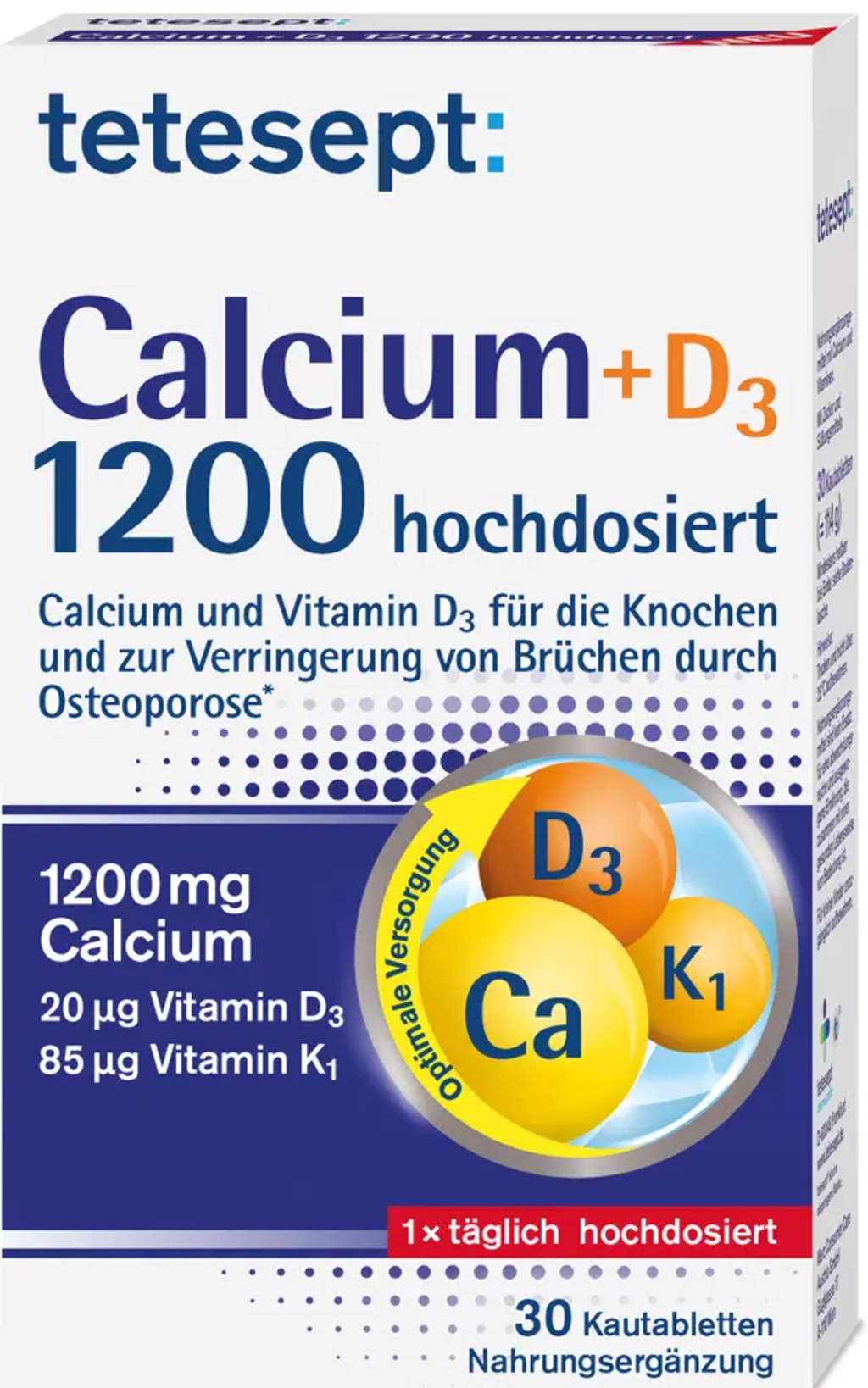 High-strength Calcium Chewable Tablets by tetesept provide 1200 mg of calcium per tablet. The formula is further enriched with vitamin D3, vitamin E and vitamin K1 to support the body in a variety of essential functions.